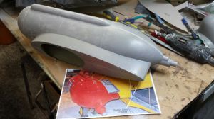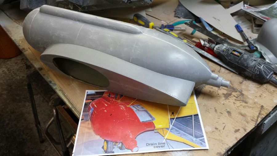 Am Urmodell wurden zuerst einige Sicken und Scale.Abdeckungen aufgebracht. Anschließend haben wir mittels Bilder aus dem Internet sowie einem Plastikmodellbausatz die Nieten abgeschaut. Da für uns klar war, das es verschiedene Versionen der CH-46 gibt, also einmal mit runden oder viereckigen Fenstern wurde nur die vordere und hintere Haube voll mit Nieten bestückt. Das Mittelteil hat die viereckigen Fenster und es wurden nur die groben Nieten drumherum gesetzt, sodass man später beide Versionen machen kann, und dann dementsprechend mit den passenden Nieten noch besetzen kann. Da für uns von vorne herein klar war eine kanadische Vorlage zu realisieren mussten auch noch die Zusatztanks erstellt werden. Hier wurde ein Urmodell aus einem Abwasserrohr, einer Tupperschüssel von Mama und Styropor geformt. Das Rohr diente als Mittelstück, die Schüssel als vordere Rundung und aus dem Styropor wurde ein Kegel auf der Drehbank geformt. Alles zusammengesetzt ergab den Tank bzw. Schwimmer. Die Form wurde so gebaut das man den Tank für links und rechts verwenden kann. Auch die Radarnase die das Original besitzt wurde auf einem Küchengerät abgenommen und eine Form erstellt. Hier kam ein Messer-Wetzstein (ebenfalls von Tupperware) zum Einsatz. Auch von der hinteren Dom-Abdeckung gibt es verschiedene Versionen. Einmal ohne und mit Hilfsturbinen-Auslass. Da diese Hilfsturbine unsere ausgewählten Vorbilder haben wurde auch diese aus Pappe und Karton geformt und eine Form erstellt. Somit haben wir nur viele kleine Anbauten, die das Modell nochmal richtig abhebt von der Grundform. Für die Fenster wurden ebenfalls Tiefziehformen gebaut. Die runden Fenster an den Seiten sind im Original gewölbt, so genannte „Bubble-Fenster“ diese wurden aus einer Plastik-Halbkugel aus dem Bastelladen gegossen und eine Tiefziehform gebaut.