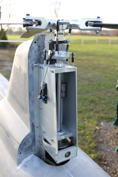 Da wir nun schon einige Erfahrungen gesammelt hatten, und in etwa wussten auf was es ankommt, war das Konzept relativ schnell fertig. Wer den guten Papa Bernd kennt, weiss das es so einfach und simpel wie möglich sein sollte. Auch hier bei dem großen Tandem hat er es wieder geschafft eine geniale Mechanik mit wenig Teilen zu bauen. Beim Tandem Heli kommt es durch die zwei gegeneinander rollenden Rotoren zu einer großen Verwindung, die entweder ein tragender Rumpf, oder eine tragende Mechanik abfangen muss. Unsere Vorliebe ist ein tragender Rumpf, zum einen hat sich das Prinzip bei der Piasecki H21 bewährt, und spart hier bei dem großen Tandem einiges an Gewicht. Doch ist es enorm Wichtig den Rumpf stabil, steif und nicht all zu schwer zu bauen. Somit haben wir uns entschlossen den Rumpf komplett aus Kohlefaser zu laminieren. Die Mechaniken haben 3mm starke Seitenteile und werden mittels 3mm starken Winkeln mit dem Rumpf verheiratet. Im Rumpf inneren sind nur zwei Rumpfgurte, für zum einen nochmal versteifen des Rumpfes sowie für die Lagerbefestigung der Verbindungswelle zwischen den Rotoren. Die Mechaniken sind im Prinzip einfache 90° Winkelgetriebe die miteinander verbunden werden, und von der vorderen Mechanik angetrieben werden. Beim Getriebe entschlossen wir uns für Spiralverzahnte Stahlzähnräder mit der Übersetzung 3:1 aus dem Hause Mädler. Um Gewicht zu sparen, wurden diese bei uns auf der Drehbank noch überarbeitet und das Gewicht hat sich fasst halbiert. Als Rotorwellen haben wir 12mm dickes gehärtetes Wellen Material verwendet. An der vorderen Mechanik sitzt der komplette Antriebstrang, also Motor und Regler. Der Motor wird über ein 10mm breites Delrin Zahnrad mit dem Getriebe über zwei Freiläufe verbunden. Die Verbindung zwischen den beiden Rotoren erfolgt über eine 12x1mm starke Edelstahlwelle die mittels Eigenbau Kupplungen gekoppelt werden. Die Kupplungen sind gleich wie in der kleinen Piasecki, und haben sich über Jahre bewährt. Das Teil an der Mechanik hat drei Löcher, die im Kreis jeweils 120° versetzt angeordnet sind, und haben eine Bohrung von 8mm. Das Gegenstück auf der Welle ist genau das selbe, nur mit drei 6mm Stahlstiften die verklebt sind. Auf den Stahlstiften wurde Silikonschläuche aufgezogen, um eine kleine Dämpfung zu bekommen. Das System ist absolut sicher, denn selbst wenn der Schlauch verschleißt, kann die Kupplung nicht auseinander fallen. Ebenfalls an der vorderen Mechanik sitzt das Bugrad, somit musste keine spezielle Halterung im Rumpf angebracht werden. Auch von der Position hat es perfekt zum Original gepasst. Ein weiterer wichtiger Punkt sind und waren die Rotorköpfe. Uns war klar, das die Blätter relativ weich sein müssen, um die Belastung der gegeneinander kippenden Rotoren aus der Mechanik zu nehmen. Doch durch Stefan Reusch wurde auch klar, das die Dämpfung der Rotorköpfen sehr weich sein muss. Anfangs haben wir versucht die Köpfe für unser Projekt selbst zu machen, allerdings wäre der Aufwand sehr groß geworden, allein weil unsere Maschinen nicht optimal dafür sind. Lange haben wir dann nach einem weich gedämpften und robusten 3-Blatt Rotorkopf gesucht. Zusammen mit Stefan haben wir dann die neuen 3-Blatt Köpfe von SAB also dem Goblin Urukay entdeckt. Nach recherchieren haben wir herausgefunden das diese frei aufgehängte Blattlagerwellen und sehr weich zu Dämpfen sind - also genau richtig. Vom Maßstab haben diese auch ideal gepasst, und ob diese auch stabil genug sind kam gar nicht in Frage, denn wenn man sieht wie diese auf dem Goblin 700 von den 3D Piloten gefordert werden, langweilt sich der Kopf auf dem Tandem. Zur Anlenkung der Rotorköpfe haben wir in den Seitenteilen zwei Aussparungen für die Servos gemacht, und gehen mittels eines Y-Gestänge zur Taumelscheibe. Die Taumelscheiben haben wir anfangs selbst gemacht, da eben noch nicht klar war ob wir die Köpfe auch selbst machen oder etwas kaufen. Beim SAB HPS3 Rotorkopf sind auch Taumelscheiben dabei, die man hätte umbauen können. Doch selbst ist der Mann, und wir haben unsere Eigenbau-Taumelscheiben verwendet. Nun waren die Mechaniken soweit fertig, und bereit für den Einbau. Da am Rumpf die vordere und hintere Haube abnehmbar, und dort zwei glatte Flächen sind, konnte man dort die Mechaniken perfekt ansetzten. Es wurden lediglich 6mm Holzplatten aus Flugzeugsperrholz hinter den beiden Flächen verklebt. Die Mechaniken werden an den Winkeln (siehe Bilder) mit dem Rumpf mit nur sechs Schrauben jeweils verschraubt. Viermal oben, und zweimal unten. Unten wurden ebenfalls Alu-Winkel quer im Rumpf verklebt. Durch die langen Winkel an der Mechanik und die sechsfache Verschraubung ist auch die Kraft optimal verteilt, und die Verwindung wird gut abgefangen. Die Lagerung der Edelstahlwelle zwischen den beiden Rotoren läuft winklig zu den beiden Mechaniken. Auch hier haben die Eigenbau-Kupplungen einen Vorteil, denn sie gleichen kleine Winkel Unterschiede aus. Zum Schluss wurden die Rotorköpfe noch passend verbohrt, und der erste Prototyp war bereit für den Erstflug, der an Weihnachten 2014 stattfand.