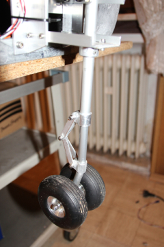 Auch hier haben wir etwas überlegt, und wollten uns erst eins bauen lassen von einem Fahrwerkhersteller für Jet-Modelle. Doch wir wollen irgentwie immer alles selbst machen, und hatten dann auch eine Idee. Da die Flügelstummel abnehmbar sind, war es schon mal einfacher ein Fahrwerk anzubringen. Im inneren des Rumpfes wurden wieder 6mm starke Holzplatten verklebt, wodurch ein Vierkantrohr gesteckt und verklebt wurde. Somit hatten wir wie eine Traverse, und eine stabile Aufhängung für das Fahrwerk. Das hintere Fahrwerk besteht aus zwei Rohren welche genau ineinander passen. Auf das äußere Rohr also das Tragende haben wir ein M10 Gewinde geschnitten. Somit haben wir das Bein durch das Vierkantrohr gesteckt und mit einer Mutter verschraubt. Die Mutter wurde anschließend noch verklebt und mit Schrauben befestigt das sie sich nicht mehr drehen konnte. So konnte man das Fahrwerksbein einfach rein schrauben. Das Fahrwerk haben wir gefedert gebaut, und für das Scale-Auge mit Feder-Schenkel ausgestattet. Das Fahrwerk ist so gefedert das der Heli am Boden komplett eingefedert ist, und keine Resonanzen beim hochlaufen entstehen können. Das vordere Fahrwerksbein ist genau so gebaut, nur Scale mäßig angepasst. Es wird an der vorderen Mechanik mittels Winkeln gehalten, und die Option besteht es lenkbar zu machen. Als Räder entschlossen wir uns für Luft befüllte Räder in der passenden Größe aus dem Hause Conrad.
