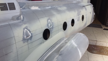 Da das Vorbilder, also die „301“ viele Details hat, haben wir versucht diese bestmöglich nach zu empfinden. Auf der linken Rumpfseite befindet sich eine HF Antenne für gute Funkleistungen über weite Entfernungen. Die Halter der Antenne haben wir aus 2mm starken Epoxy-Platten ausgesägt, und mit Feile und Dremel nachgearbeitet. Das Rundmaterial was die Antenne darstellen soll wurde aus 3mm dickem Rohr realisiert. Rechts neben der Tür zur Kabine befindet sich beim Original eine Seilwinde, um Besatzungsmitglieder aus der Luft zum Einsatzort herab zu lassen, wenn die Mission z.B. über Gewässer stattfindet. Hier haben wir vorerst nur den Sockel der Winde vorbereitet, evtl. bauen wir später mal eine Winde nach, und können diese dann dort anbringen. Auch die Abgasrohre wurden im Rumpf angebracht. Hier haben wir Abwasserrohre aus dem Baumarkt verwendet. Im inneren der Turbinen sitzen selbstgebaute Blechturbinenräder. Unter anderem haben wir viele kleine Nieten auf den Rumpf gesetzt. Zuerst wurden alle Nieten auf dem Rumpf mit Lineal und Bleistift angezeichnet. Anschließend wurden die Nieten aus einer Mischung von Holzleim und Babypuder mittels einer Spritze mit 0,7mm dicker Kanüle aufgebracht. Es befinden sich etwa 150.000 Nieten auf dem Rumpf. Auch die ganzen Antennen auf dem Rumpf haben wir nachgebaut. Hier hatten wir noch alte Heckrotorblätter – Formen von früher, die optimal gepasst haben, diese wurden laminiert und am Rumpf nach der Lackierung angebracht. Am Rumpfende hat das Original Ölabdeckungen, diese wurden aus einer Plastikverpackung laminiert und ebenfalls am Rumpf angebracht. Für die Abstrebungen der Tanks/Schwimmer wurden auch die Abdeckungen der Befestigungen am Rumpf laminiert. Als Streben haben wir Vorhang-Stangen genommen, denn diese sind profiliert und haben perfekt gepasst. Auch die ganzen Öffnungen/Belüftungen haben wir mit dem Dremel wie beim Original ausgeschnitten, und mit Gitter aus dem Baumarkt hinterklebt.