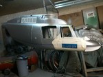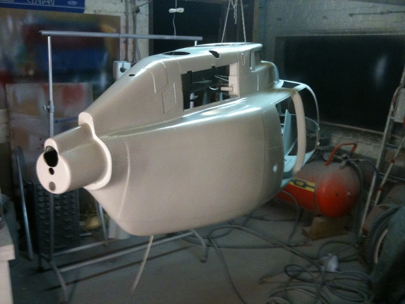 Zu hause angekommen ging es sofort los... erst wurde eines unserer beiden Helizimmer zu einer Werkstatt bzw. zu einem "Endmontage-Zimmer" eingerichtet. Anschließend haben wir die Helis im Innenraum mit grauer Farbe ausgemalt. Dabei musste man sehr aufpassen das man den neuen Lack nicht gleich weider "einsaut"....war sehr anstrengend :) Als dies erledigt war, wurden einige Scale Details wie z.B Kabelschneider und Scale-Schrauben angebracht. Danach ging es los mit den Mechanik und Elektronik einbauten. Vorne befinden sich 2x 12v Halogen Strahler die als Landescheinwerfer dienen. Diese kann man dann durch einen elektonischen Schalter mit einem Relais Ein- und Aussalten. Auch die Stromversorgung sowie Akkus wurden in der Front verbaut. Als all diese teile erledigt waren, wurde die Verglasung verschraubt und die Mechanik eingebaut. Zum Schluss wurden alle Kabel sauber und ordentlich verlegt, Cockpit eingebaut und das Flybarless-System programmiert.
