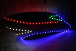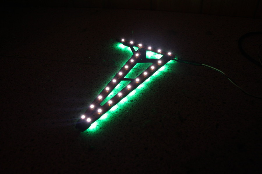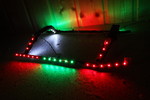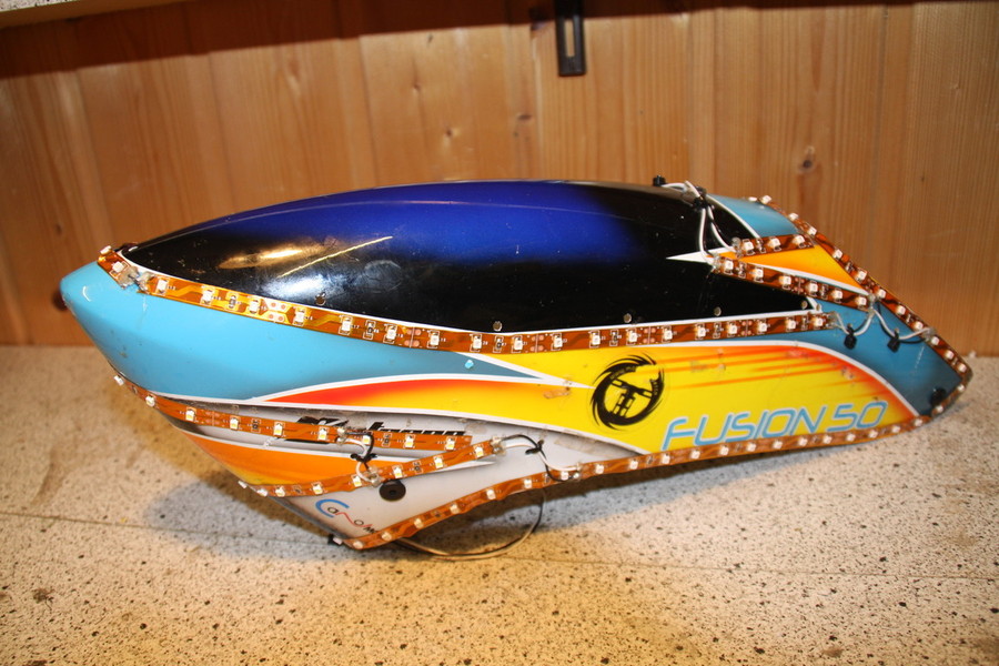 Da nur ein Elektroheli vorhanden ist, nämlich der Fusion 50, wollte ich Nachtflugzubehör das man schnell an den Heli hin und wieder ab montieren kann. Gesagt getan: Ich bersorgte mit ein zweites paar Kufen, eine zweite Heckfinne sowie eine Haube die ich noch vom letzten Crash mit leichten Kratzern übrig hatte. Da viele auf die LED-Streifen von Hobbyking setzten, endschloss auch ich mich, die kostengünstigen LED-Streifen zu verbauen. Diese gibt es in den Farben: rot, grün, blau und weiss von denen ich jeweils 2m bestellte. Stückpreis pro Meter ist ca. 6$. Nach schneller Lieferung überlegte ich mir ein Design und verklebte die selbstkelbenden Streifen auf den Heliteilen. Anschließend wurde alles verlötet und verkabelt. Ich machte mir ein Adapter, an das ich alle Teile an einem Zentralen Punkt zusammen bringen kann und von dort aus an die Stromquelle gehen kann.